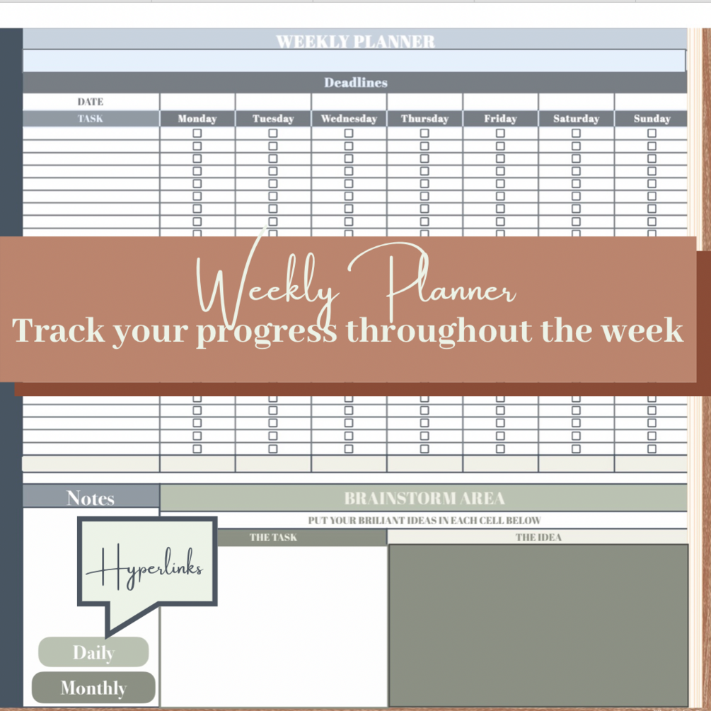Weekly templates include a checklist to track your progress every day of the week, a to-do list, and a brainstorming area.
