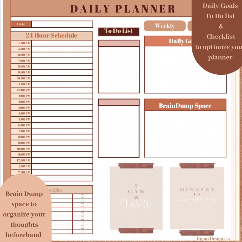 Each Daily Template includes 24-hour schedules, a to-do list section, a daily goals section, a checklist section, and a brain dump space so you can plan out every detail of your day.